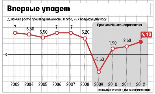 После прошлогоднего роста производительности труда на 5,2% (Росстат) в этом году аналитики Минэкономразвития прогнозируют ее снижение на 5,6%. Это будет первое снижение производительности, по крайней мере, с 2003 г. По данным макроэкономического прогноза министерства на 2010-2012 гг., возобновление роста может начаться в следующем году — на 1,9% в 2010 г., на 2,6% — в 2011 г. и на 4,1% — в 2012 г. Ведущий экономист ЦМАКП Игорь Поляков объясняет «упадническую» цифру тем, что в России традиционно спад производства не пропорционален сокращению занятости. Согласно прогнозу Министерства экономического развития, по итогам 2009 г. численность занятых в экономике снизится на 3% (с 68,5 млн. человек до 66,4 млн. человек), в то время как ВВП — на 8,5%.