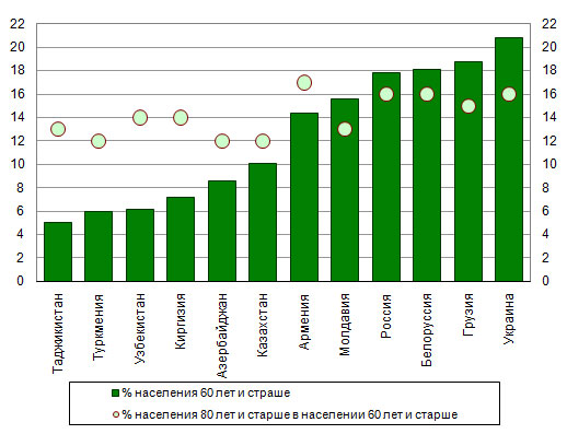 старше по странам СНГ, %, 2009 год, ООН (UN Population Division)