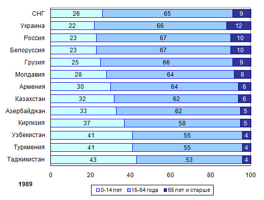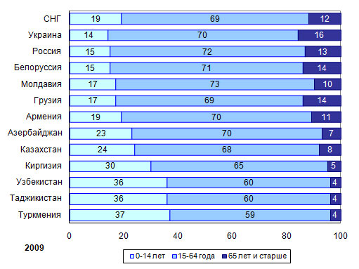 Доля населения в возрасте от 15 до 65 лет составляет от 59% в Туркмении