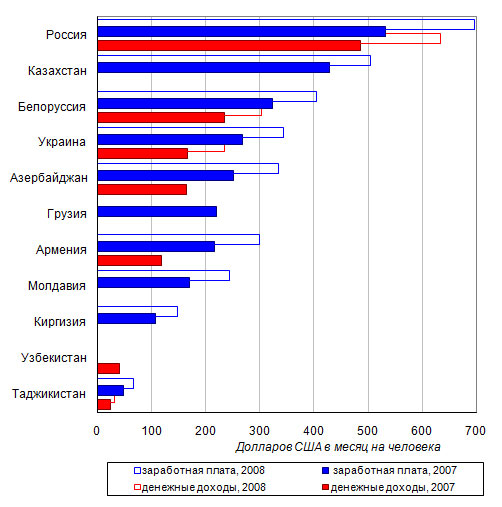 долларов США в месяц в Таджикистане до 532 в России, а в 2008 году