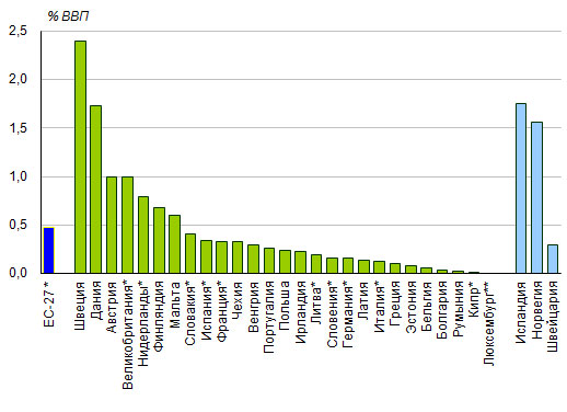 - от 0% в Болгарии, Румынии и на Кипре до 2,4% ВВП в Швеции