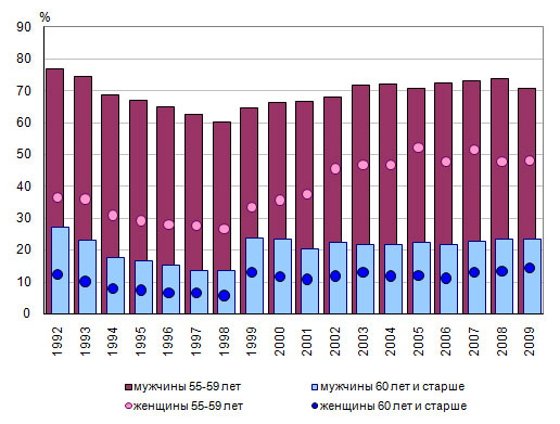 | Экономическая занятость населения старших возрастов понемногу растет – в 2009 году в возрасте 60 лет и старше она составила 23,5% у мужчин и 14,4% у женщин, а среди пенсионеров – 30%