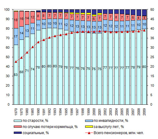 по видам пенсионного обеспечения (в %), 1970-2009 годы5