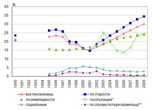 году до 6,7% в 2009 году). Доля пенсионеров, получающих пенсии по