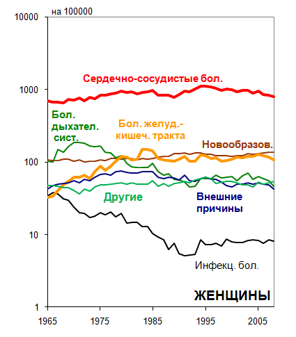 от основных классов причин смерти в 1965-2008 годах, по полу, логарифмическая