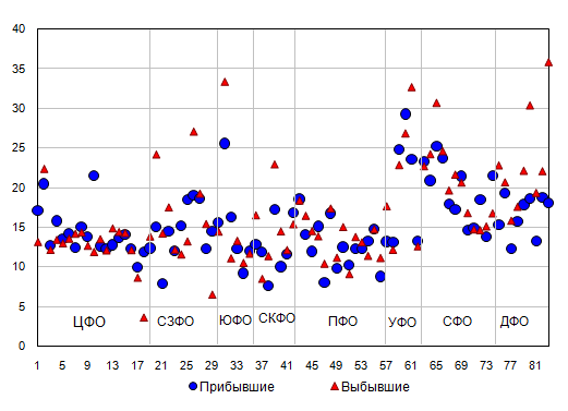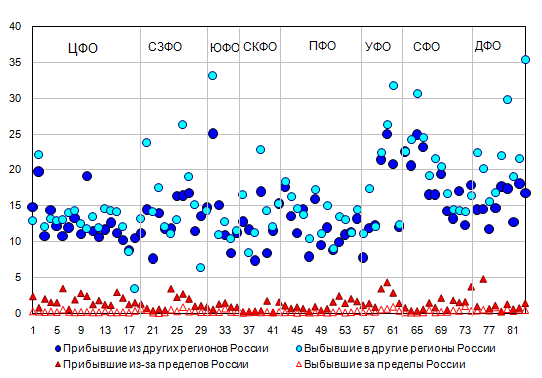 Рисунок 28. Внутренние и внешние мигранты в регионах-субъектах