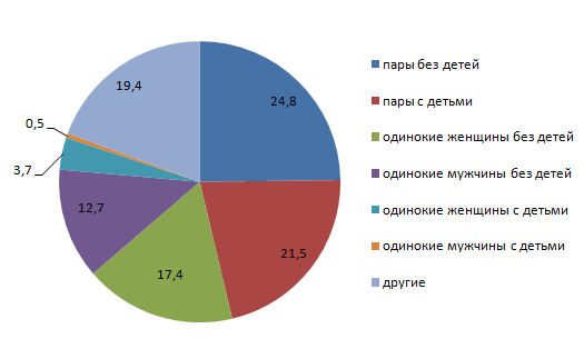 мужчины без детей, 4% - одинокие женщины с детьми, 0,5% - одинокие