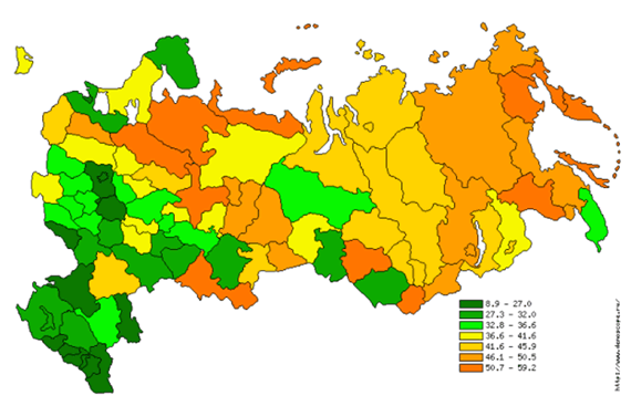 республики Северного Кавказа) и самым высоким (Иркутская обл.) составила