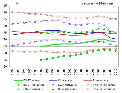 20-64 лет в ЕС-27, США и Японии, 1992-2010 годы, %