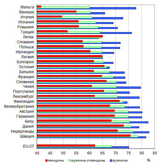 от 41,6% на Мальте до 75,7% в Швеции, а среди мужчин – от 63,6%