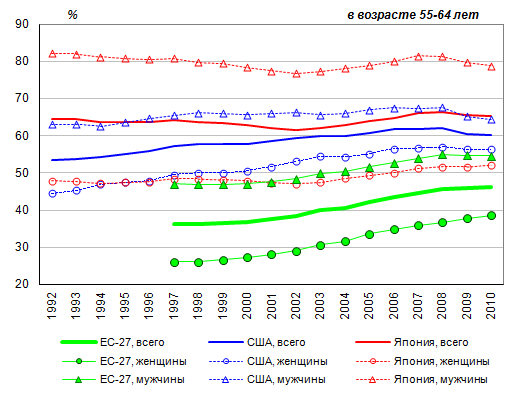 против 54,6%). В 2009-2010 году занятость мужчин 55-64 лет сокращалась,