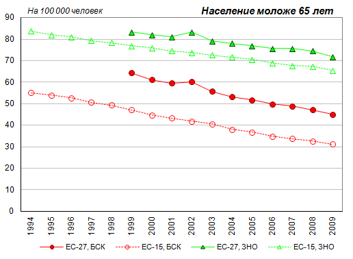 (ЗНО) в ЕС-27 и ЕС-15, 1994-2009 годы, население моложе 65 лет,