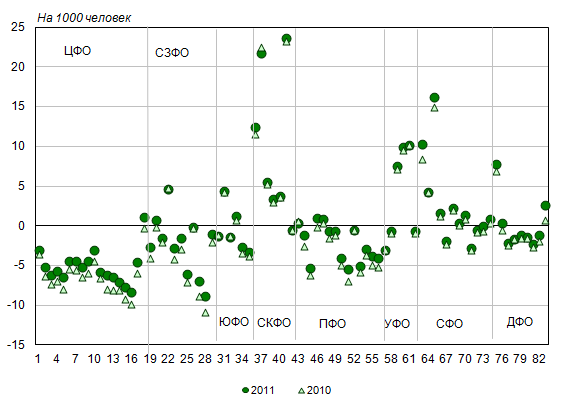 в 2011 году от -12,2‰ в Республике Тыве до +15,1‰ в Московской области.