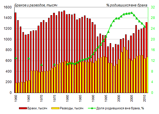 в России (тысяч) и доля родившихся вне брака (%), 1960-2011 годы