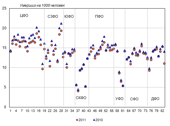 (Росстата), в 2011 году число умерших и общий коэффициент смертности