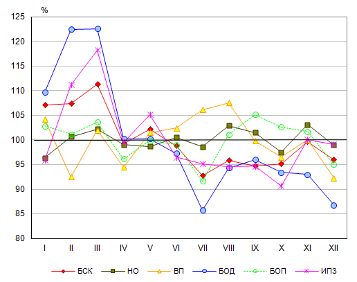 Рисунок 12. Сезонные отклонения помесячных чисел умерших