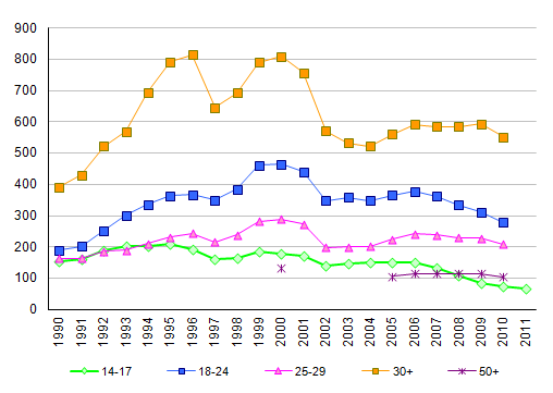 16 до 30 лет. Среди подростков 14-15 лет она вдвое ниже и примерно