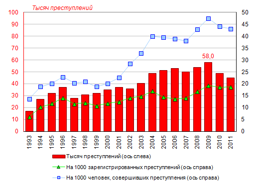 |  | Преступность в России снижается пятый год подряд - в 2011 году было зарегистрировано 2,4 миллиона преступлений и 1,7 миллиона потерпевших в результате преступных посягательств