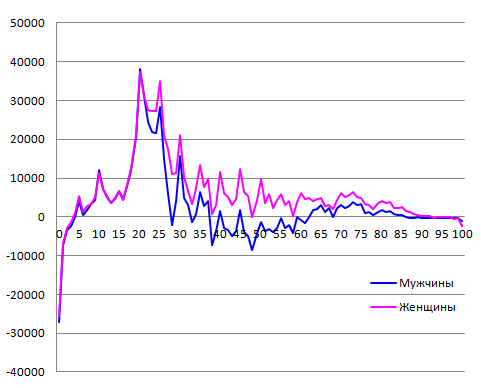 в уравнении демографического баланса, и то, заметим, благодаря миграции,