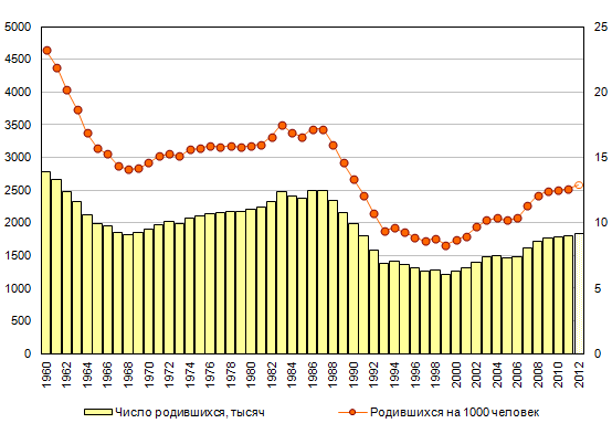 Рисунок 12. Число родившихся в России, 1960-2012 годы,
