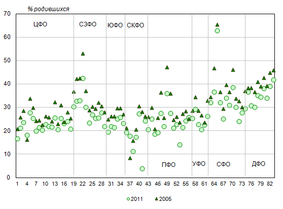 низкой отметки, снижение рождаемости охватило 85 из 89 регионов-субъектов