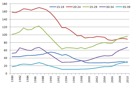 до 25 лет с 2006 года сокращается, число женщин тех возрастов, в