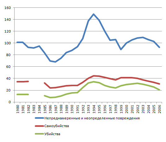 самоубийств и убийств в России, 1980-2006 (число убитых на 100000