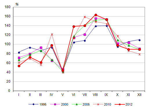 по месяцам 1995, 2000, 2005, 2010 и 2012 годов, тысяч
