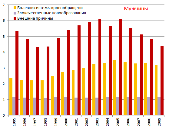 смертности мужчин от трех классов причин смерти в России к соответствующим