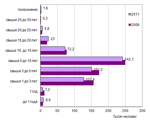 колониях России, по сроку заключения (наказания), 2006 и 2011 годы