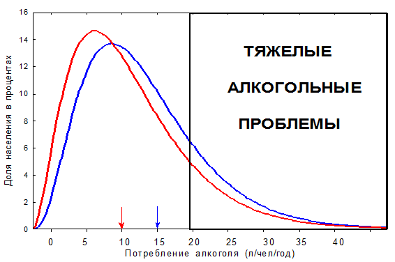 среднего потребления (на графике - от 10 до 15 литров чистого алкоголя