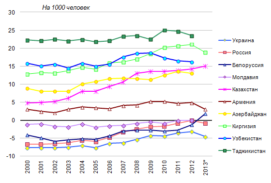 -0,03‰ в России, -1,2‰ в Белоруссии и -3,1‰ на Украине. По данным