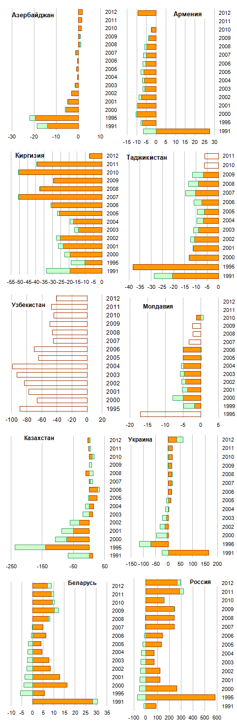 СНГ в отдельные годы терял часть населения (отрицательное сальдо