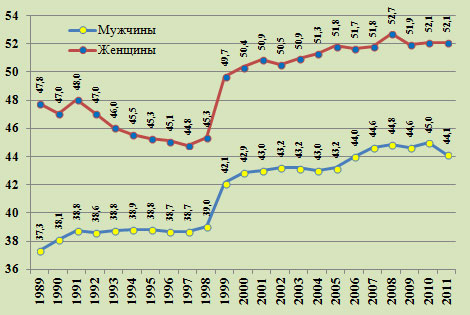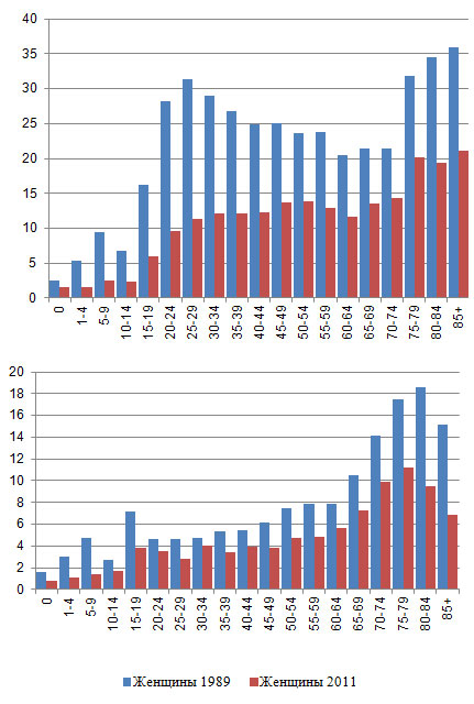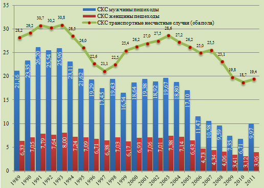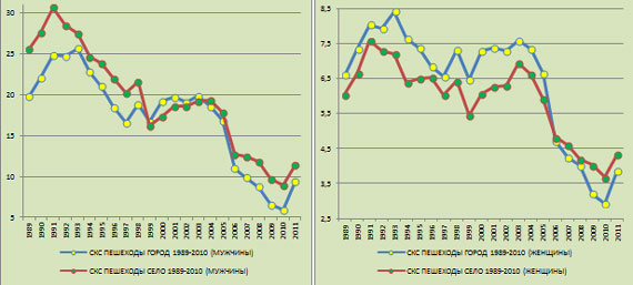 вклада женской пешеходной смертности - с 23% в 1989 до 31,7% в 2010