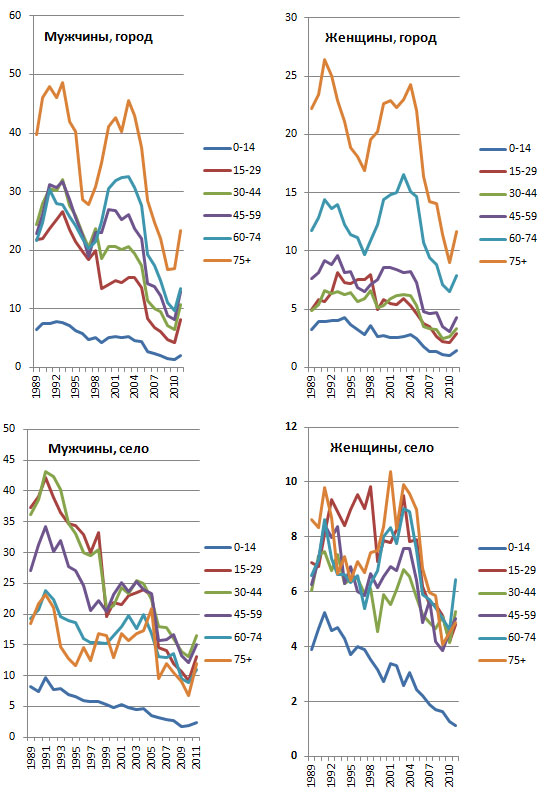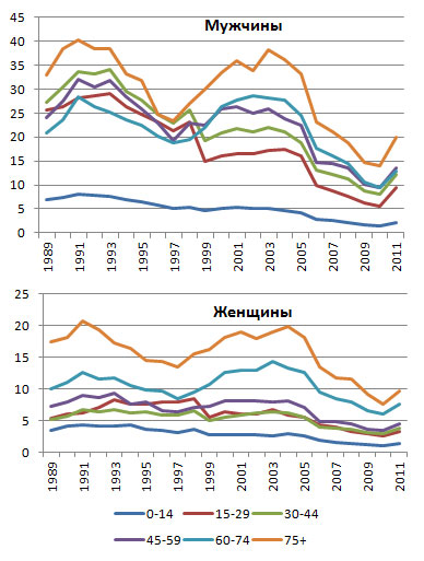 возрастают незначительно, тогда как в России риски с возрастом увеличиваются