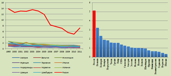 некоторых странах, 1995-2011 гг. (слева) и общий коэффициент смертности
