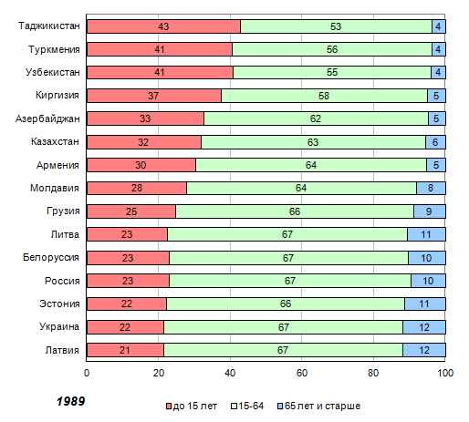в возрасте до 15 лет в 1989 году составляла от 21,4% в Латвии до