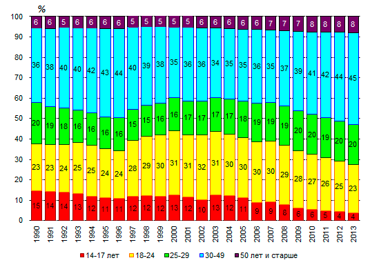 силу, устойчиво снижается доля подростков 14-17 лет – в 2013 году
