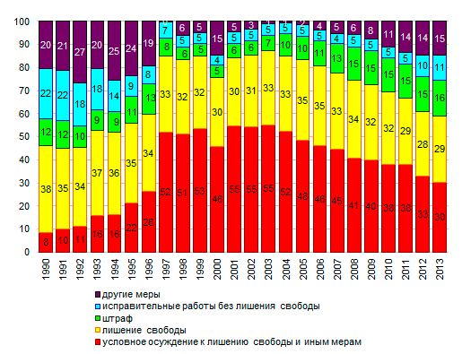 мерам наказания, назначенным судом, 1990-2013 годы, %