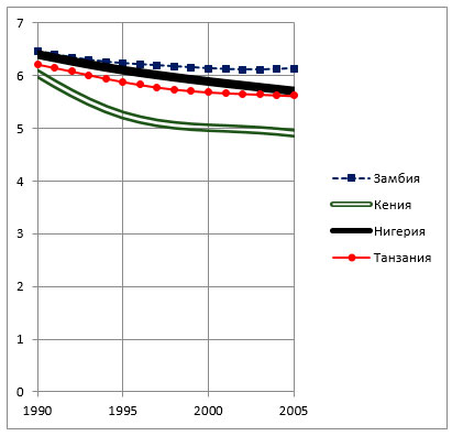 рождаемости в некоторых странах Тропической Африки, 1990-2005 гг.