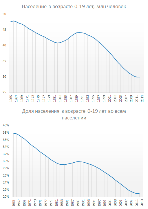 снижения рождаемости, число и доля «детей» в населении, хотя и с