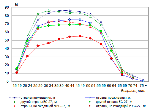 стран, не входящих в ЕС-27, наиболее высока в возрастах от 35 до