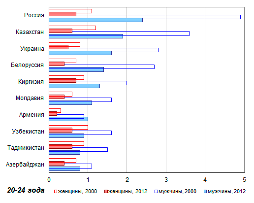 20-24 года по странам СНГ, 2000 и 2012 годы, умерших на 1000 человек