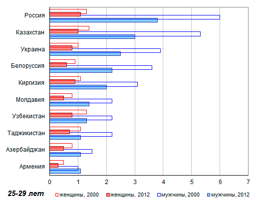 25-29 лет по странам СНГ, 2000 и 2012 годы, умерших на 1000 человек