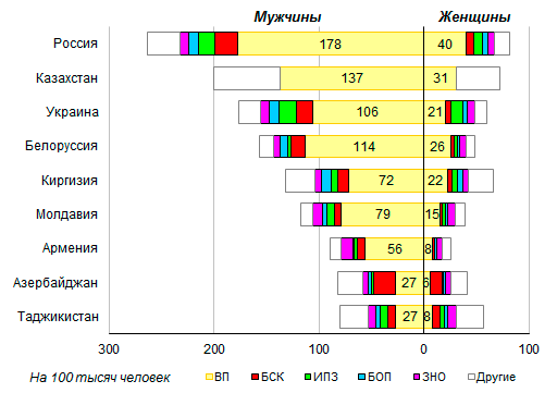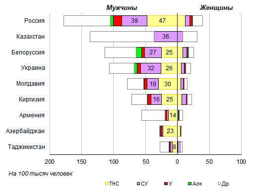 (47 умерших на 100 тысяч человек), самоубийств (39) и убийств (14).