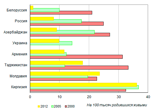странах СНГ, 2000, 2005 и 2012 годы, на 100 тысяч родившихся живыми