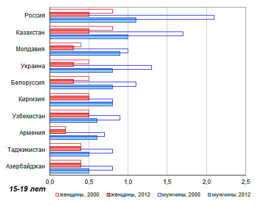 По данным за 2012 год, смертность юношей 15-19 лет составляла