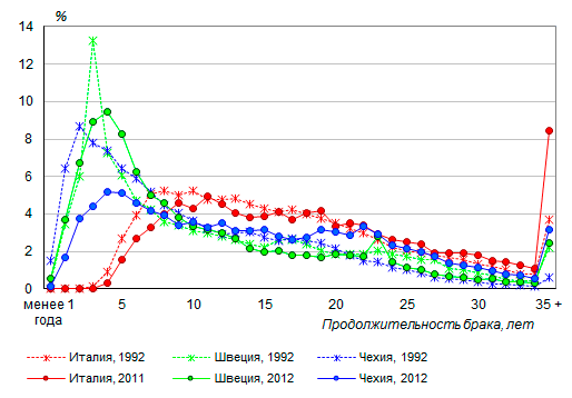 По данным за 2011-2012 годы, доля браков продолжительностью