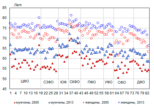 года. Рубеж в 70 лет был превышен в 41 регионе, тогда как в 2005