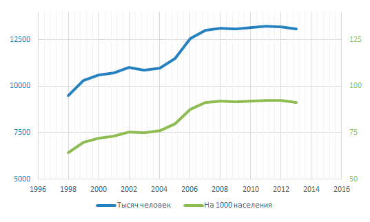 в России на начало 2013 года составило 13,08 млн человек, что в